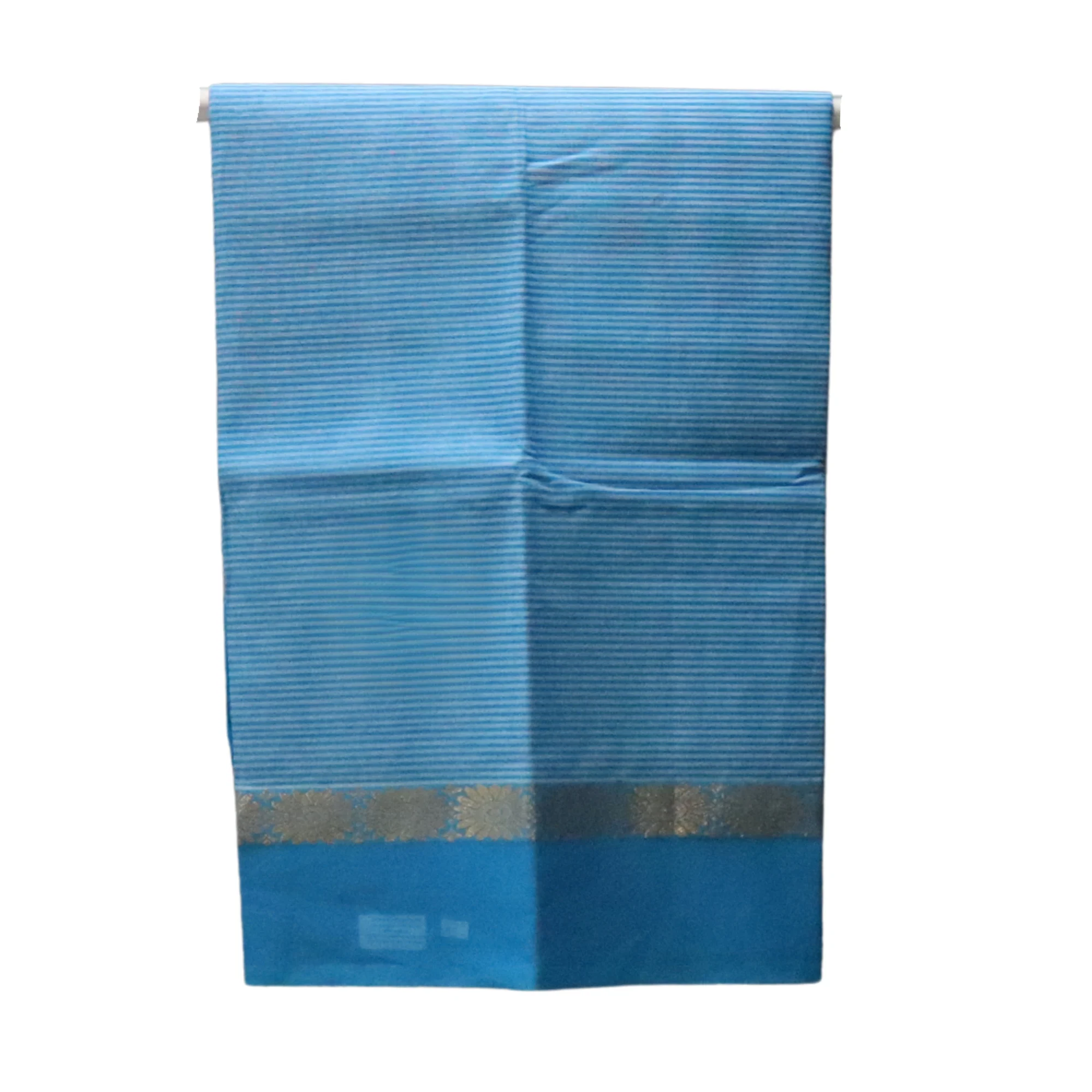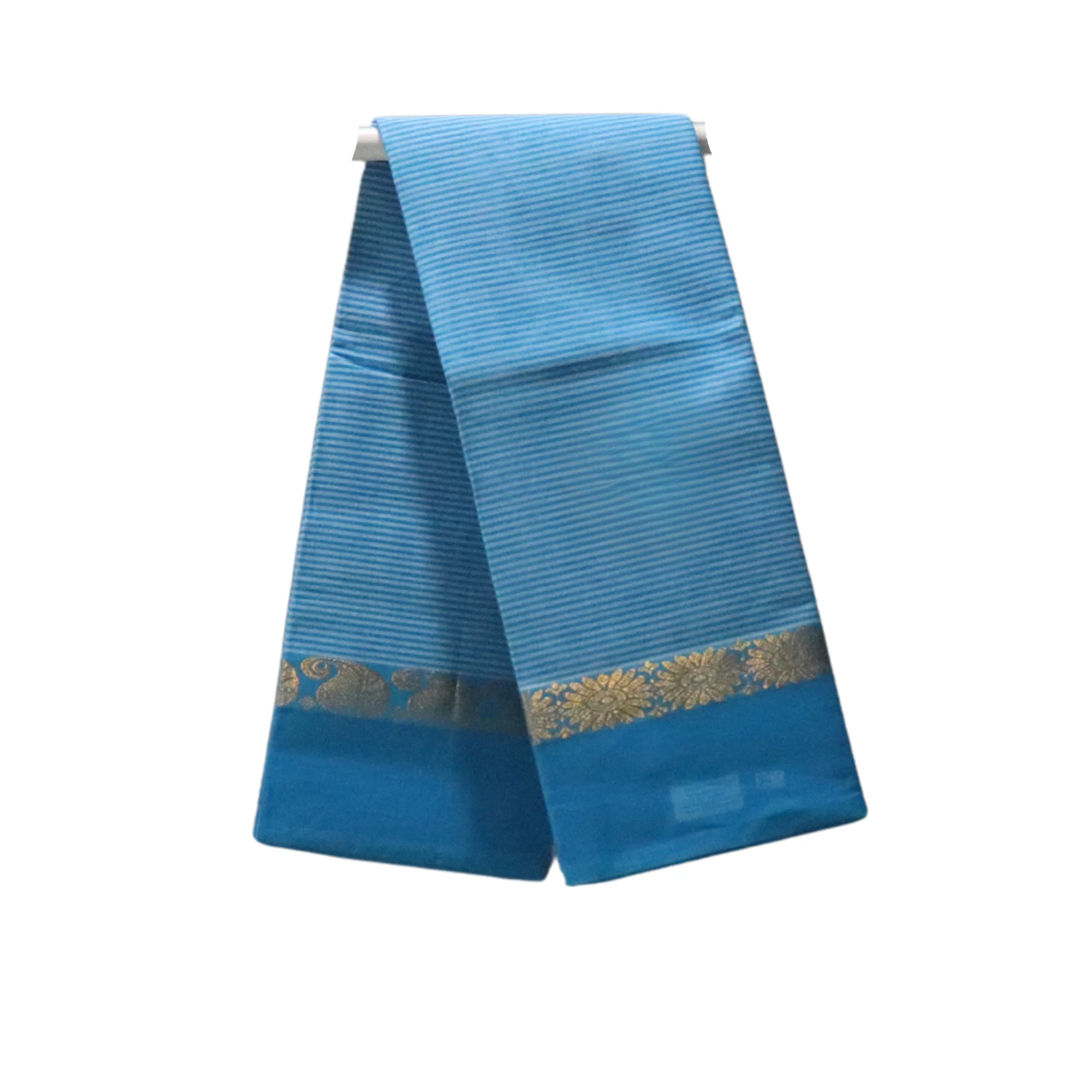 Elevate your everyday elegance with this Venkatagiri Pure Cotton Saree in a refreshing sky blue shade. The saree is adorned with delicate horizontal stripes, creating a graceful and minimal look. Its gold floral zari border, intricately woven with traditional motifs, adds a touch of sophistication and festive appeal. Crafted from premium quality handwoven cotton, this saree ensures unmatched comfort and effortless draping — ideal for both casual and special occasions.